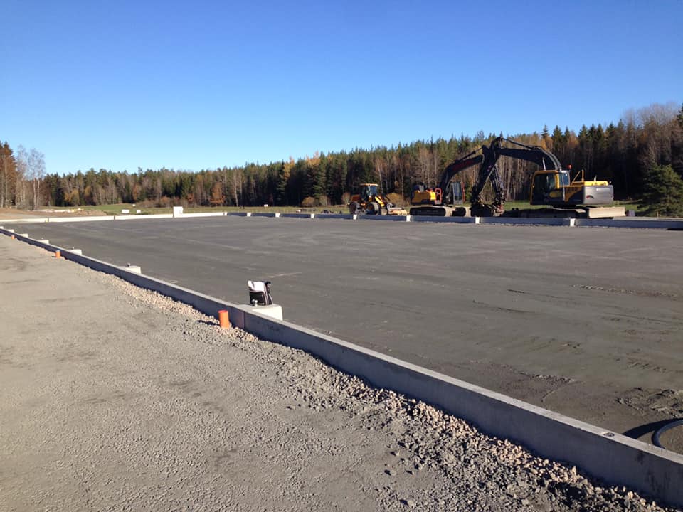 Vi tar er igenom alla momenten till en färdiggjuten platta. Vi schaktar och spränger eventuellt där grundplattan skall ligga. Grundelementen monteras och därefter monteras avloppsrör, vattenledningar, ev. rör för golvvärme och slutligen armeringsjärn innan själva plattan gjuts. Slutligen läggs dräneringsrör och singel ut runt plattan.